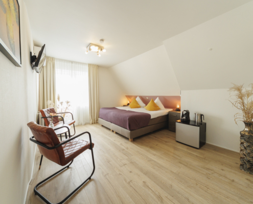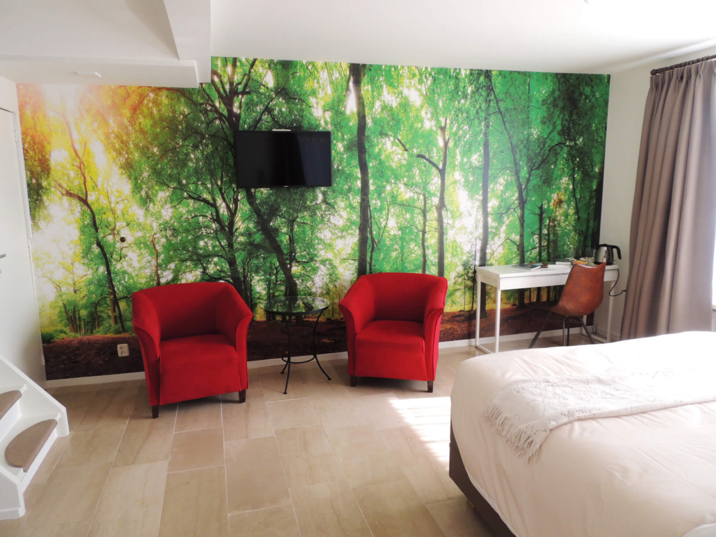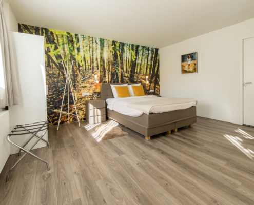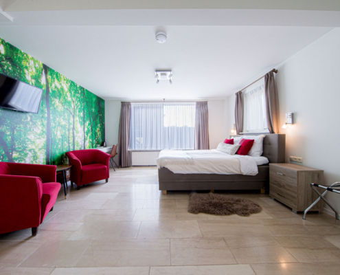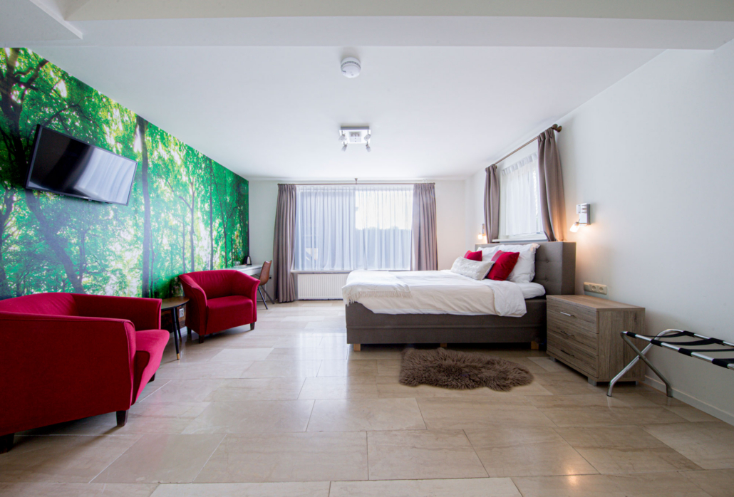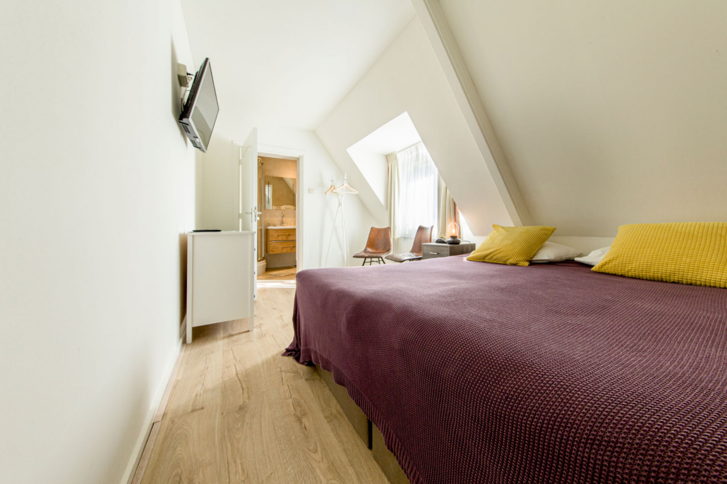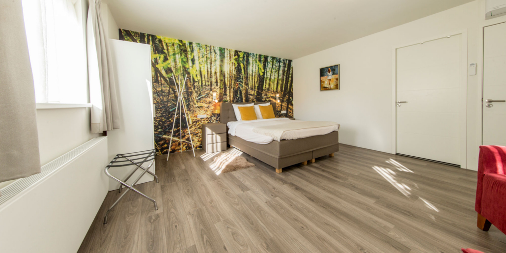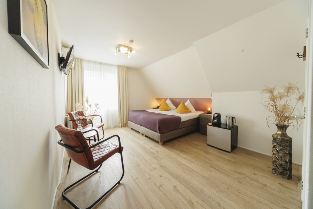 Zeer ruime tweepersoonskamer 35 m2 met een Swiss Sence tweepersoonsbed, koelkastje, Smart TV, airconditioning, koffie/thee faciliteiten, laminaatvloer en terras.