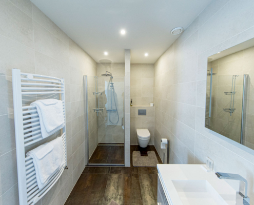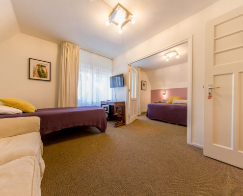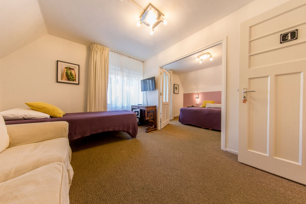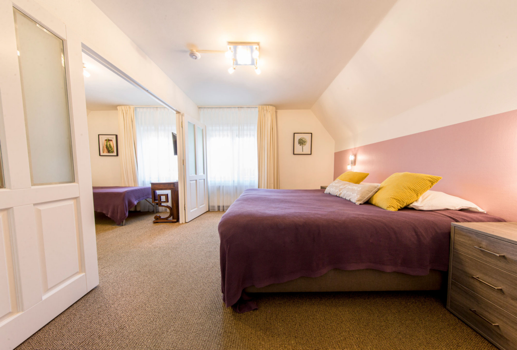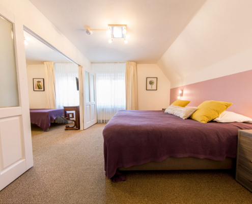 De familiekamer beschikt over een badkamer, smart tv en 2 enkele bedden naast elkaar, laminaatvloer, air conditioning, koffie/thee faciliteiten en koelkastje. Mogelijkheid om 1 bijzetbed op de familiekamer te plaatsen. Op de eerste verdieping bevindt zich nog een twee persoonskamer met 2 enkele Swiss Sense bedden. Geschikt voor 2 tot 5 personen. * Gelieve bij boeking aangeven met hoeveel volwassenen en kinderen u verblijft op de kamer.